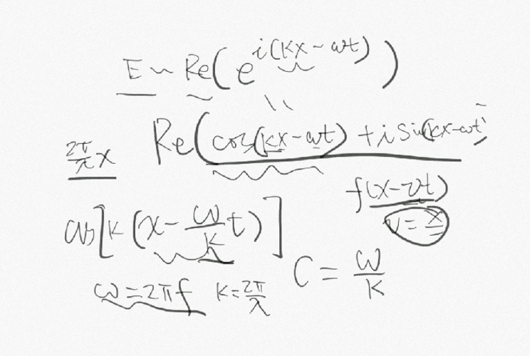 至此,张朝阳开始介绍求导得出动量和能量的方法。在平面波的式子中,动量和能量都出现在指数上,但是只要我们对位置 x 和时间 t 求偏导数,相应的动量和能量不就下来了吗?于是,张朝阳又展示了如下推导: