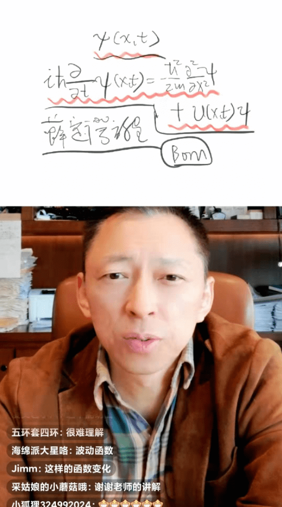 “我们今天理解了薛定谔是怎么猜到薛定谔方程的,也知道描述具有波粒二象性的微观粒子的波函数。后面,我们只要解这个方程,就能把天下所有事情给它算出来。”直播尾声,他回顾这一课的主要内容时说。同时他鼓励网友,量子力学很难懂,“会用很多堂课来讲。”据了解,下一讲他将开始解薛定谔方程,来解释氢的光谱,求一些波函数的定解,以及薛定谔方程的各种应用。