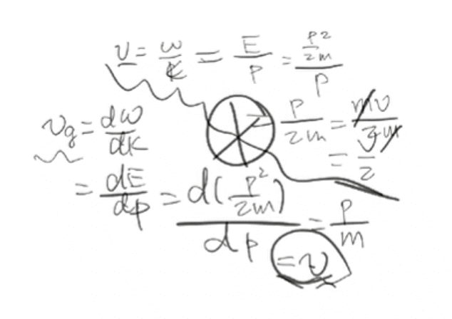 张朝阳再次演示,在量子力学中,粒子的速度不再等于 ω/k,而应该等于相应的波的群速度 dω/dk。根据张朝阳的计算,ω/k 实际上等于 v / 2,为粒子速度的一半。如果使用群速度 dω/dk 来计算,则得到了正确的速度 v。他解释道,这是因为粒子在实际观测中以波包的形式存在,群速度是描述整个波包的移动速度的,因此正好对应于粒子的速度;而 ω/k 是等相位点的移动速度,不代表粒子的运动速度。